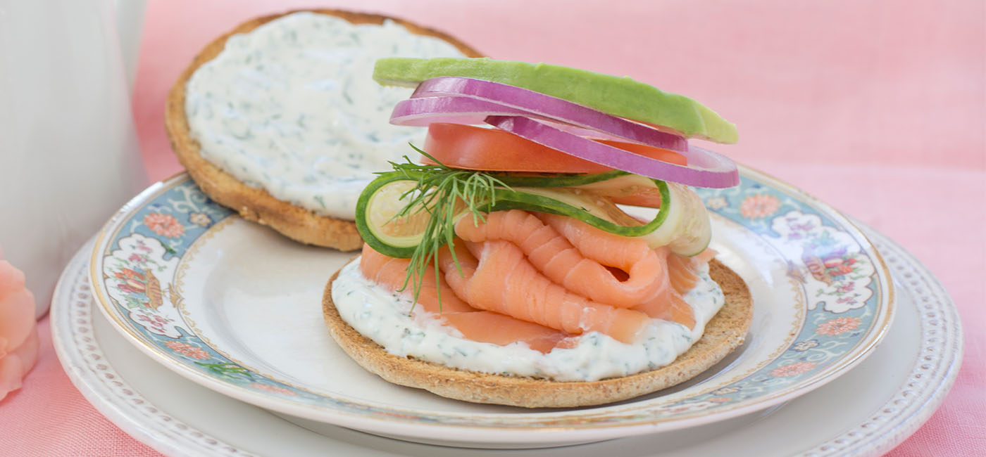 - From the bottom up, layer ingredients in the following order: lay smoked salmon (lox) onto bottom half, cucumber ribbon, dill sprig, red onion, tomato and avocado.